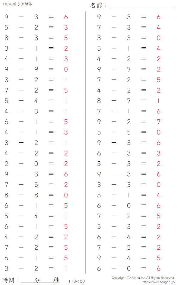 1桁の引き算(9まで) [解答]118/400