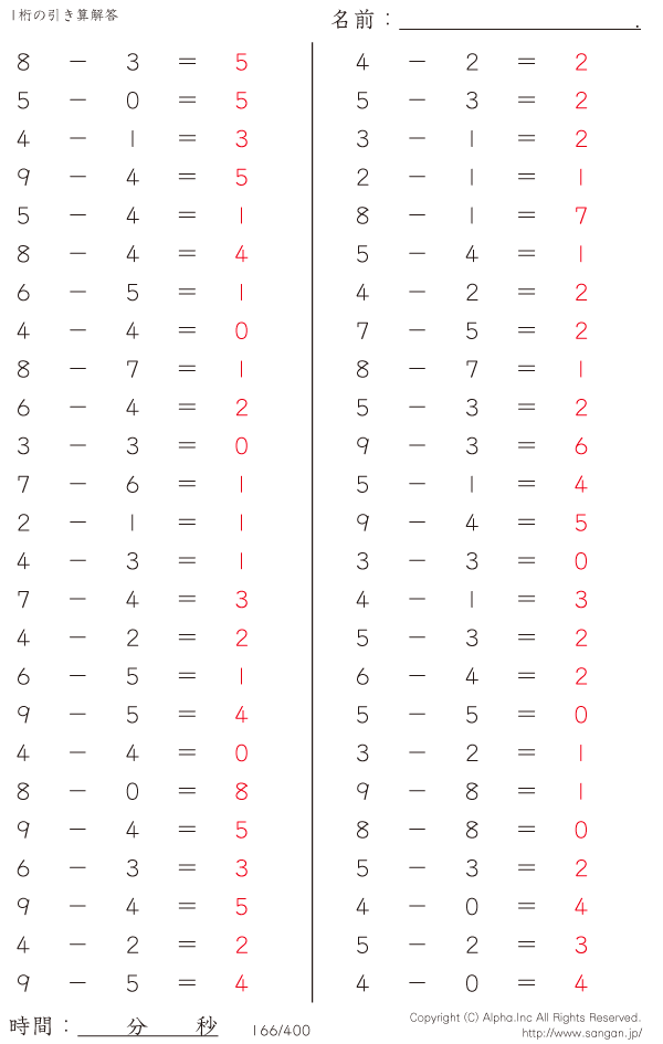 上記のボタンから「1桁の引き算(9まで)」の算数数学ドリル・計算ドリル(PDFプリント)がダウンロードできます。個人利用は無料です(家庭以外での配布は有料です)。