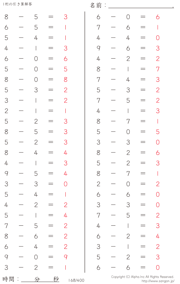 上記のボタンから「1桁の引き算(9まで)」の算数数学ドリル・計算ドリル(PDFプリント)がダウンロードできます。個人利用は無料です(家庭以外での配布は有料です)。