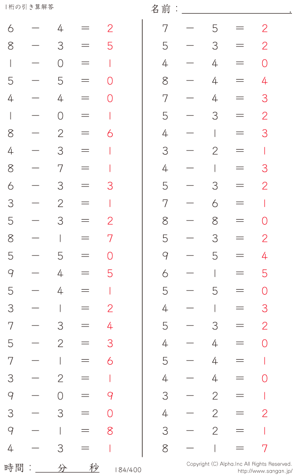 1桁の引き算(9まで) [解答]184/400