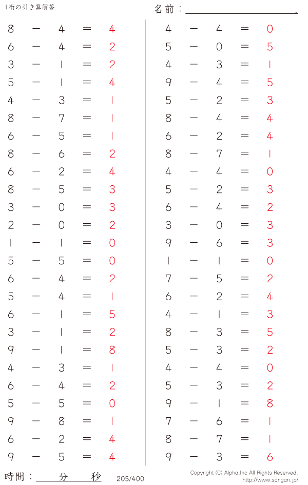 上記のボタンから「1桁の引き算(9まで)」の算数数学ドリル・計算ドリル(PDFプリント)がダウンロードできます。個人利用は無料です(家庭以外での配布は有料です)。