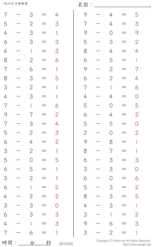 1桁の引き算(9まで) [解答]207/400