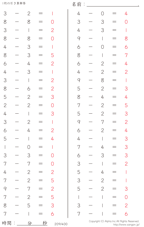 上記のボタンから「1桁の引き算(9まで)」の算数数学ドリル・計算ドリル(PDFプリント)がダウンロードできます。個人利用は無料です(家庭以外での配布は有料です)。