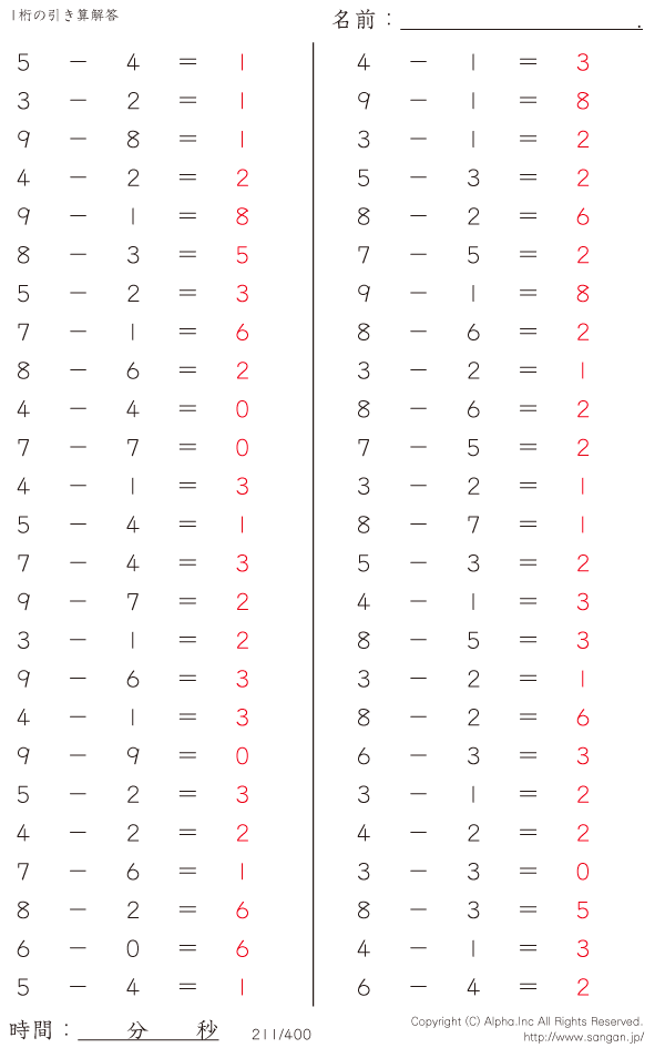 上記のボタンから「1桁の引き算(9まで)」の算数数学ドリル・計算ドリル(PDFプリント)がダウンロードできます。個人利用は無料です(家庭以外での配布は有料です)。