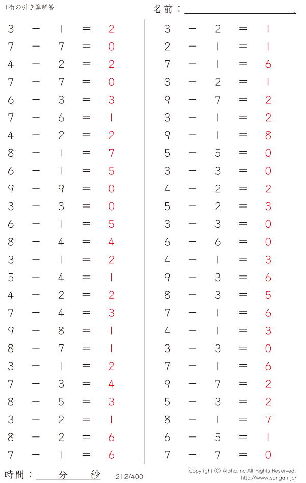 1桁の引き算(9まで) [解答]212/400