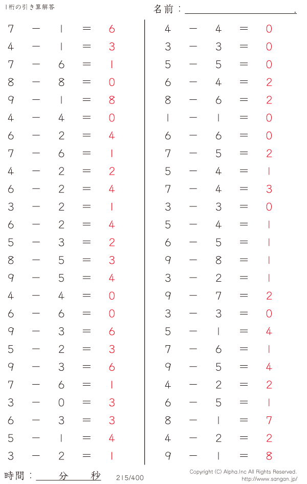 1桁の引き算(9まで) [解答]215/400