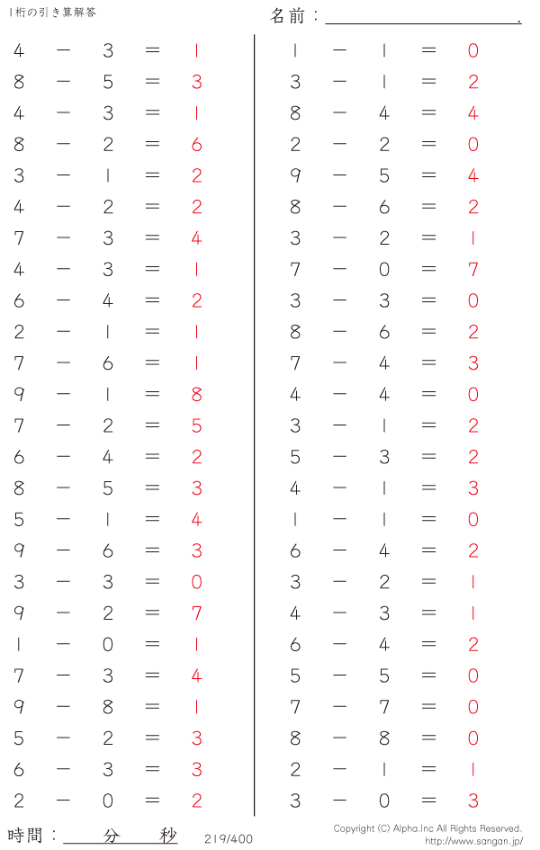 1桁の引き算(9まで) [解答]219/400