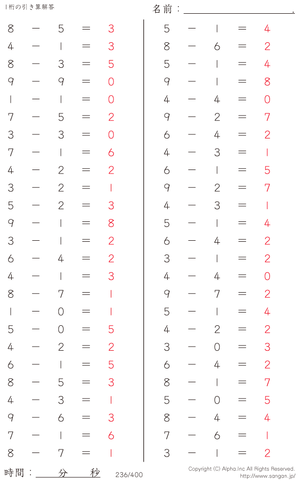 1桁の引き算(9まで) [解答]236/400