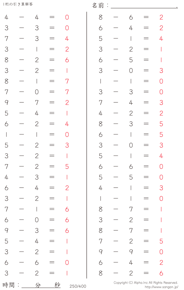上記のボタンから「1桁の引き算(9まで)」の算数数学ドリル・計算ドリル(PDFプリント)がダウンロードできます。個人利用は無料です(家庭以外での配布は有料です)。