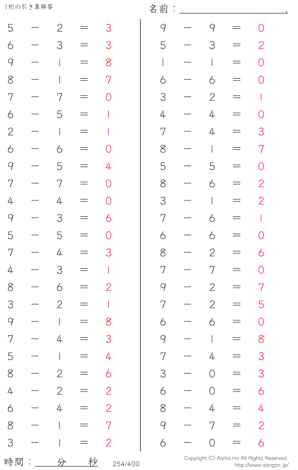 1桁の引き算(9まで) [解答]254/400