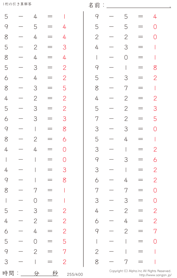 上記のボタンから「1桁の引き算(9まで)」の算数数学ドリル・計算ドリル(PDFプリント)がダウンロードできます。個人利用は無料です(家庭以外での配布は有料です)。