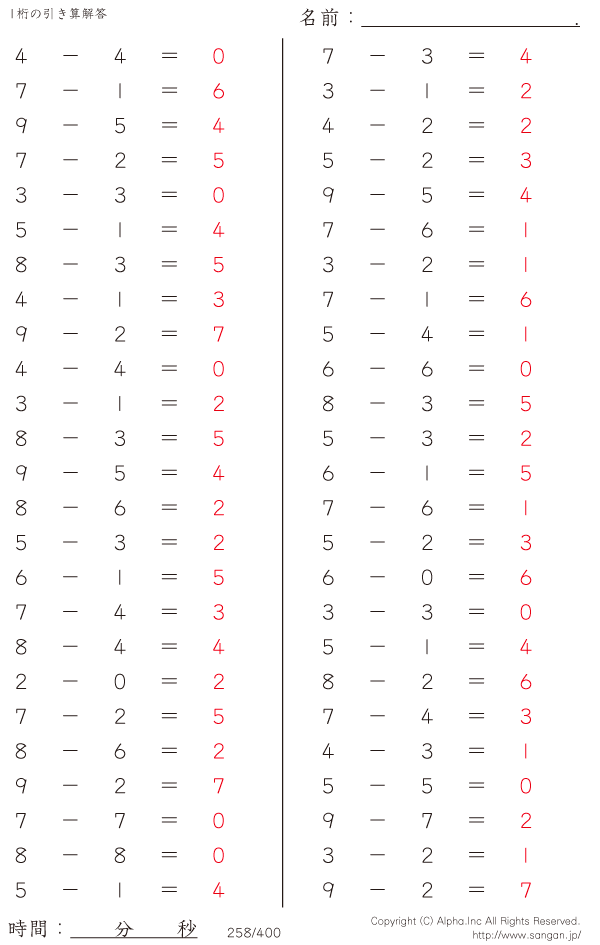 1桁の引き算(9まで) [解答]258/400