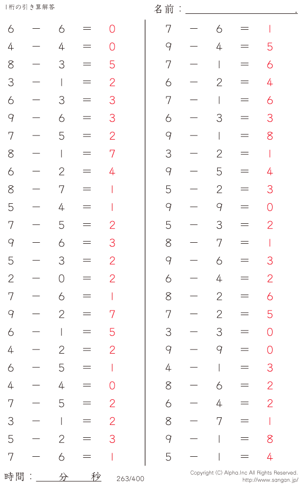 1桁の引き算(9まで) [解答]263/400