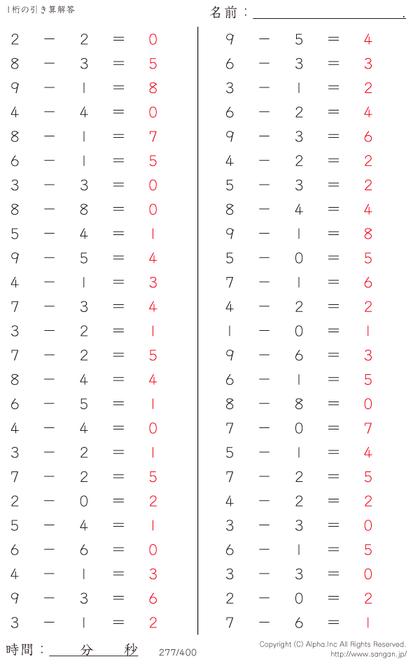 上記のボタンから「1桁の引き算(9まで)」の算数数学ドリル・計算ドリル(PDFプリント)がダウンロードできます。個人利用は無料です(家庭以外での配布は有料です)。