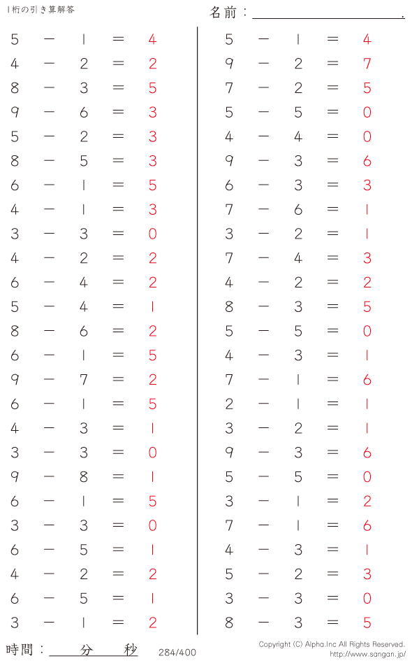 上記のボタンから「1桁の引き算(9まで)」の算数数学ドリル・計算ドリル(PDFプリント)がダウンロードできます。個人利用は無料です(家庭以外での配布は有料です)。