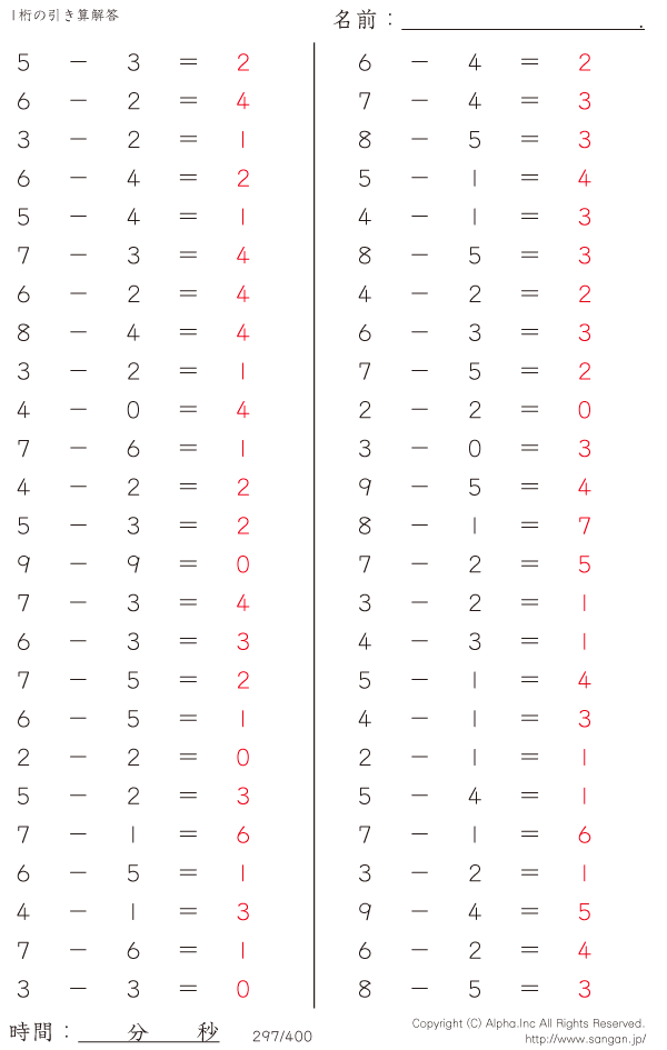 上記のボタンから「1桁の引き算(9まで)」の算数数学ドリル・計算ドリル(PDFプリント)がダウンロードできます。個人利用は無料です(家庭以外での配布は有料です)。