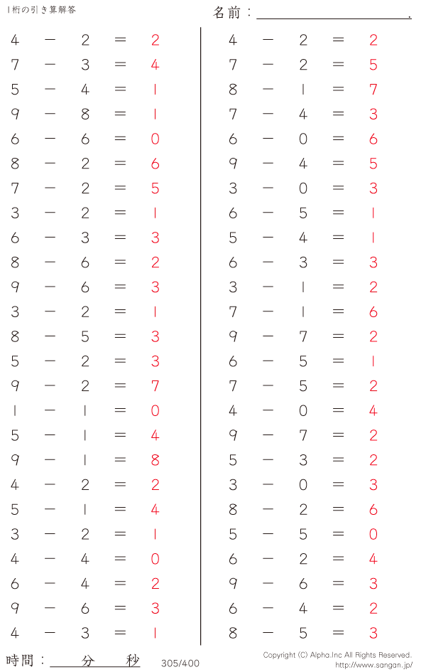 1桁の引き算(9まで) [解答]305/400