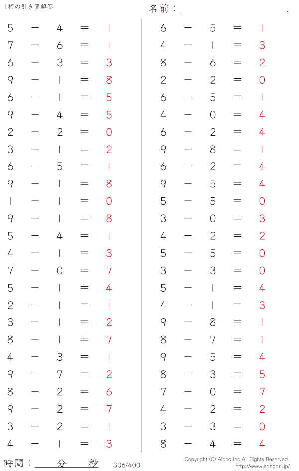 1桁の引き算(9まで) [解答]306/400