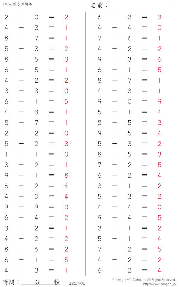 上記のボタンから「1桁の引き算(9まで)」の算数数学ドリル・計算ドリル(PDFプリント)がダウンロードできます。個人利用は無料です(家庭以外での配布は有料です)。