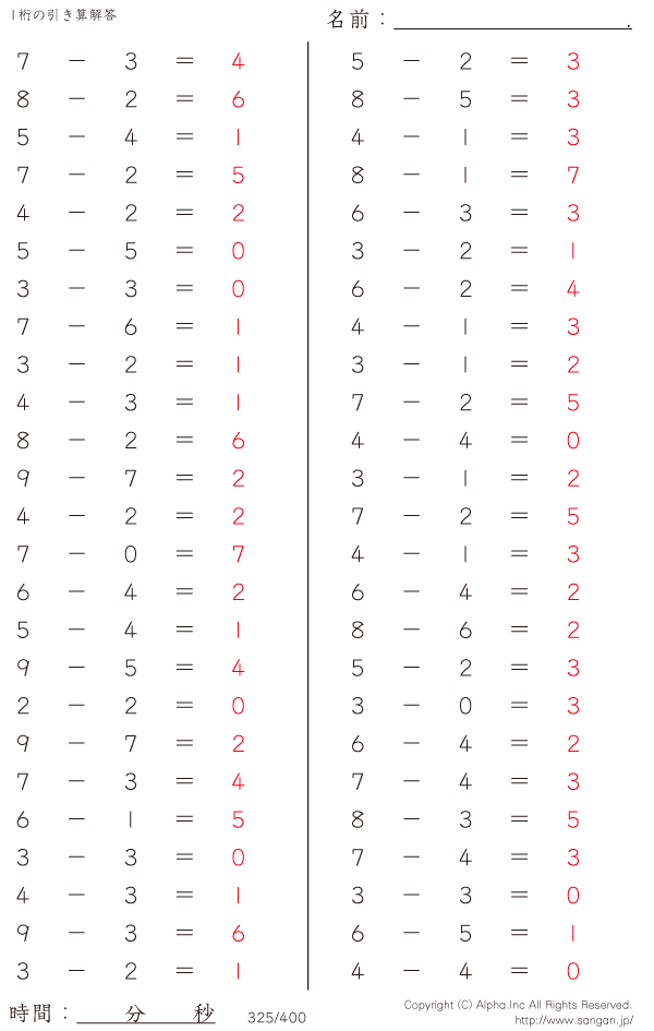 上記のボタンから「1桁の引き算(9まで)」の算数数学ドリル・計算ドリル(PDFプリント)がダウンロードできます。個人利用は無料です(家庭以外での配布は有料です)。