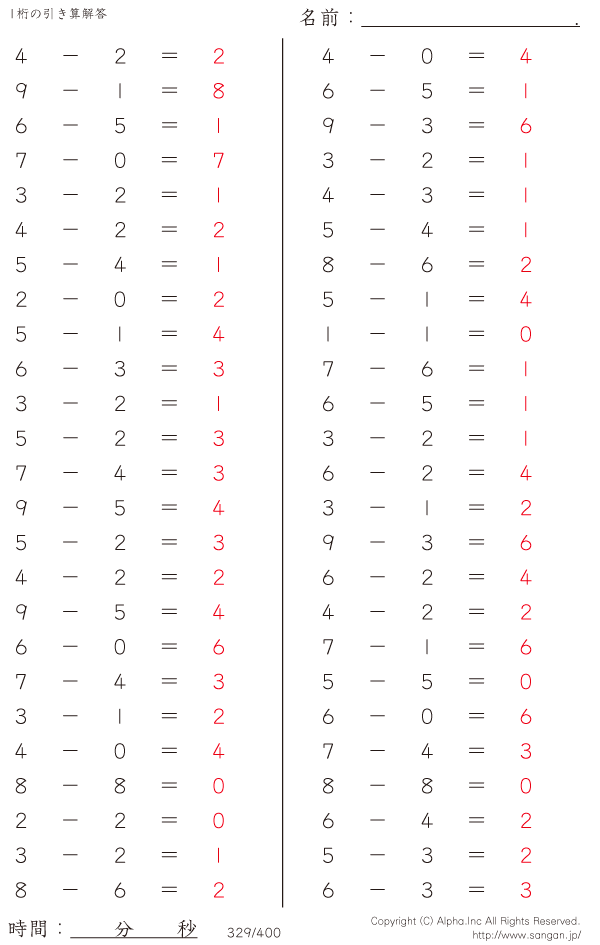 1桁の引き算(9まで) [解答]329/400