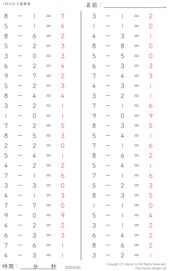 上記のボタンから「1桁の引き算(9まで)」の算数数学ドリル・計算ドリル(PDFプリント)がダウンロードできます。個人利用は無料です(家庭以外での配布は有料です)。