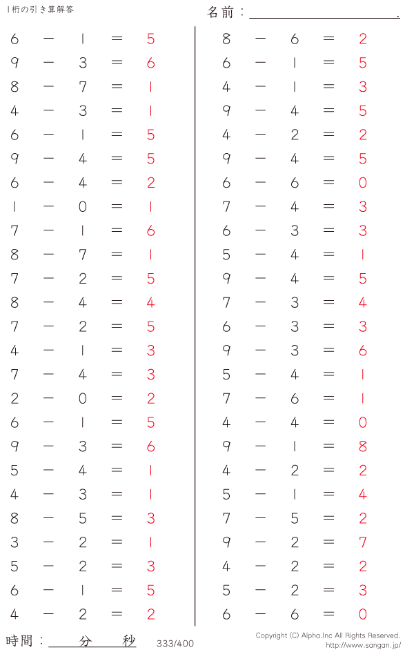 上記のボタンから「1桁の引き算(9まで)」の算数数学ドリル・計算ドリル(PDFプリント)がダウンロードできます。個人利用は無料です(家庭以外での配布は有料です)。