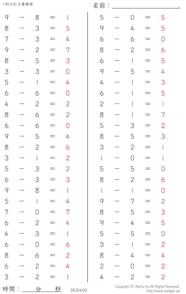 上記のボタンから「1桁の引き算(9まで)」の算数数学ドリル・計算ドリル(PDFプリント)がダウンロードできます。個人利用は無料です(家庭以外での配布は有料です)。