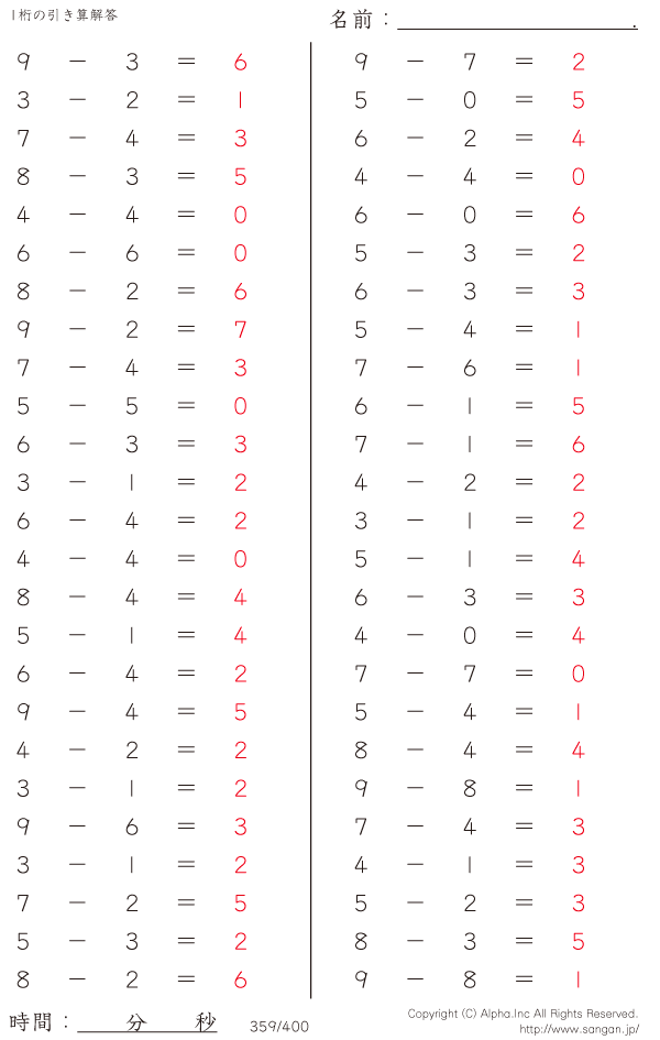 上記のボタンから「1桁の引き算(9まで)」の算数数学ドリル・計算ドリル(PDFプリント)がダウンロードできます。個人利用は無料です(家庭以外での配布は有料です)。