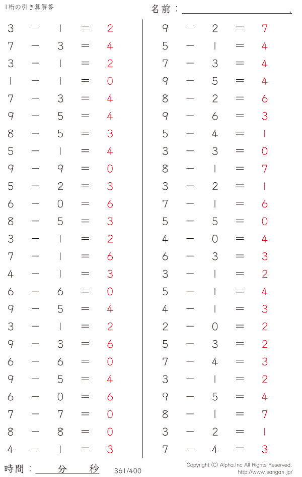 上記のボタンから「1桁の引き算(9まで)」の算数数学ドリル・計算ドリル(PDFプリント)がダウンロードできます。個人利用は無料です(家庭以外での配布は有料です)。
