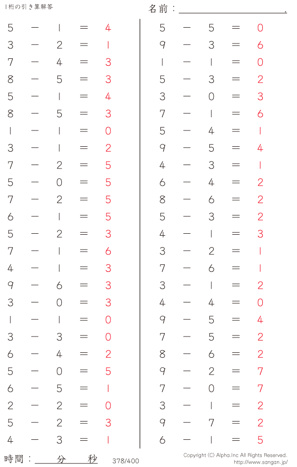1桁の引き算(9まで) [解答]378/400