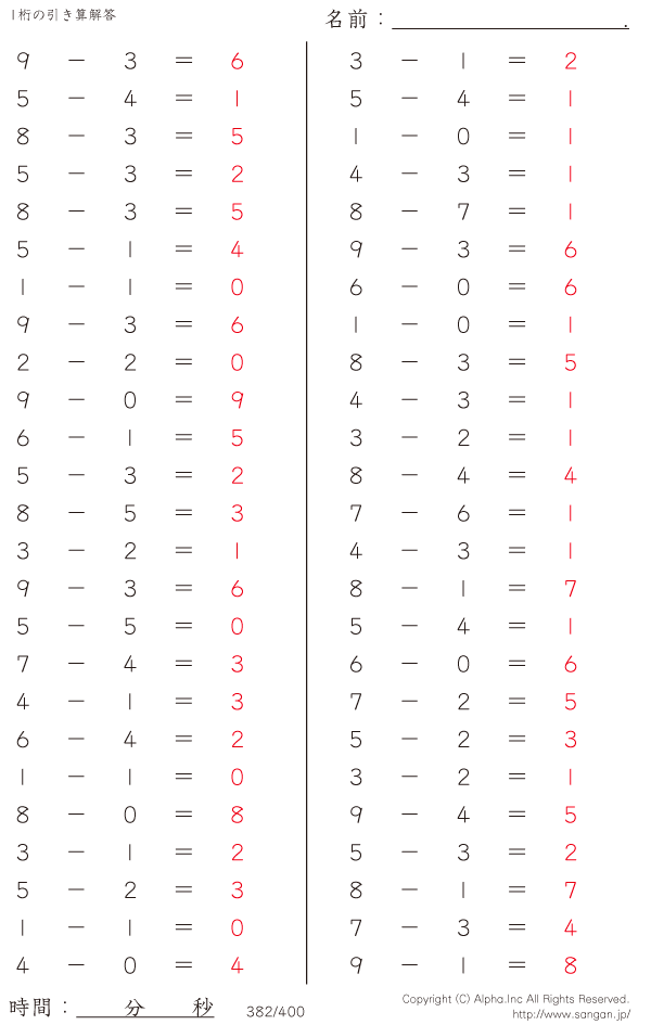 1桁の引き算(9まで) [解答]382/400