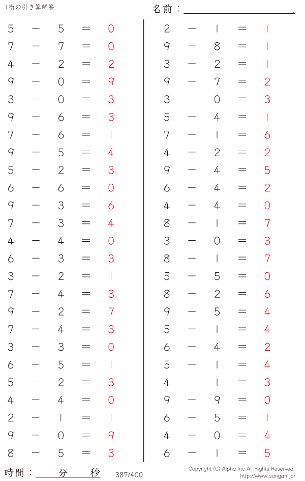 上記のボタンから「1桁の引き算(9まで)」の算数数学ドリル・計算ドリル(PDFプリント)がダウンロードできます。個人利用は無料です(家庭以外での配布は有料です)。
