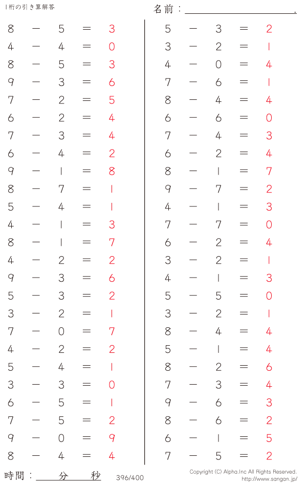 上記のボタンから「1桁の引き算(9まで)」の算数数学ドリル・計算ドリル(PDFプリント)がダウンロードできます。個人利用は無料です(家庭以外での配布は有料です)。