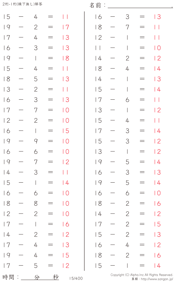 上記のボタンから「20未満-1桁(繰下無し)」の算数数学ドリル・計算ドリル(PDFプリント)がダウンロードできます。個人利用は無料です(家庭以外での配布は有料です)。