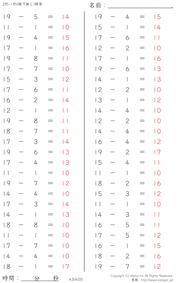 上記のボタンから「20未満-1桁(繰下無し)」の算数数学ドリル・計算ドリル(PDFプリント)がダウンロードできます。個人利用は無料です(家庭以外での配布は有料です)。