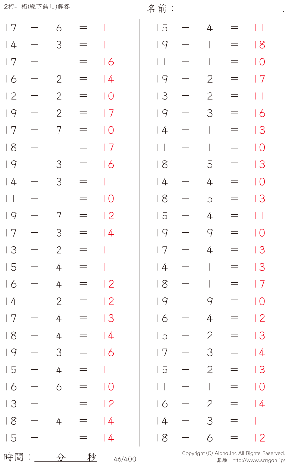 上記のボタンから「20未満-1桁(繰下無し)」の算数数学ドリル・計算ドリル(PDFプリント)がダウンロードできます。個人利用は無料です(家庭以外での配布は有料です)。