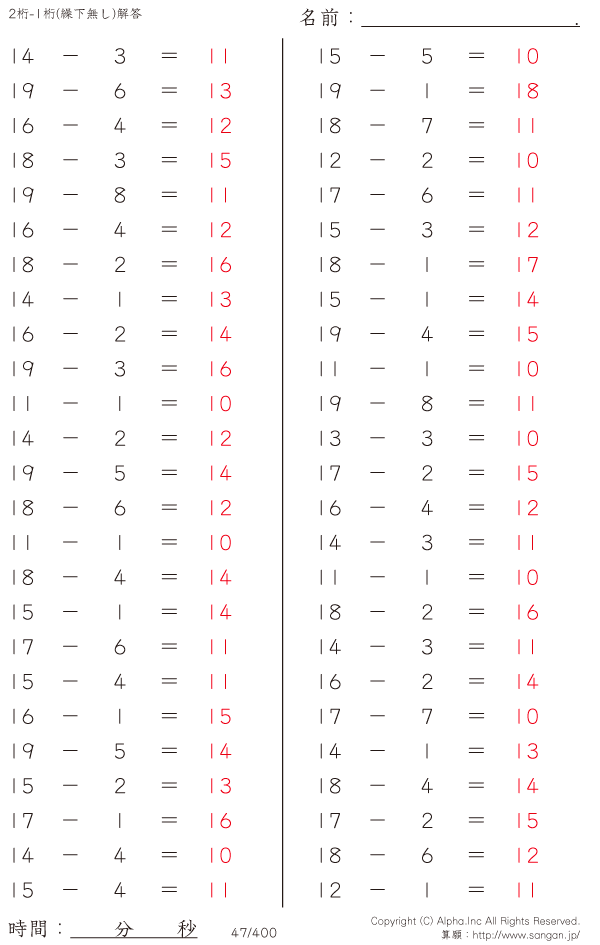 上記のボタンから「20未満-1桁(繰下無し)」の算数数学ドリル・計算ドリル(PDFプリント)がダウンロードできます。個人利用は無料です(家庭以外での配布は有料です)。