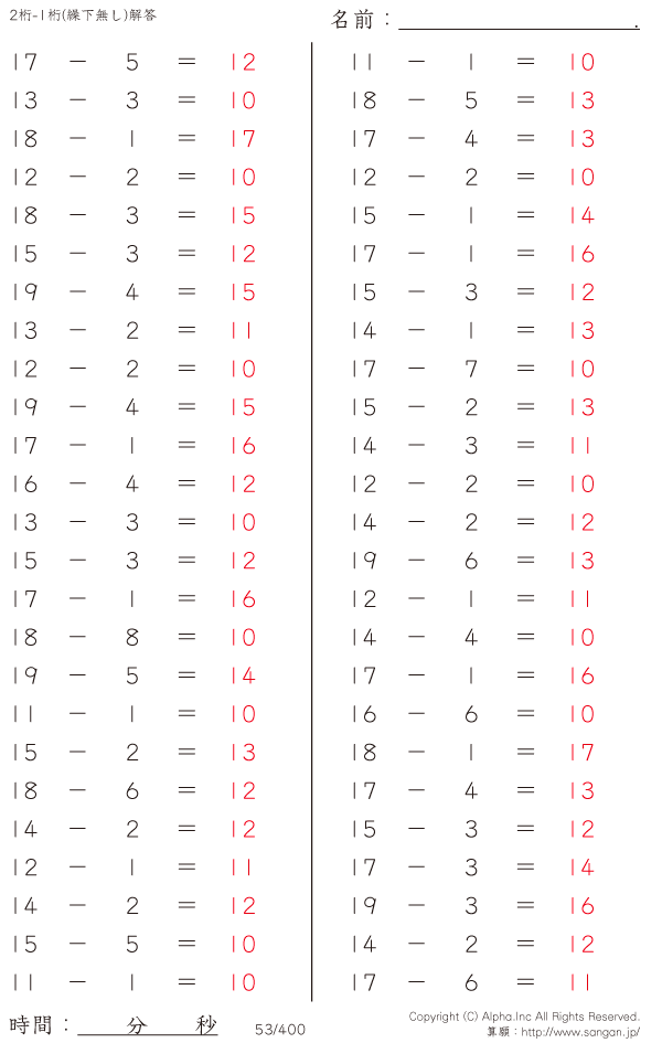 上記のボタンから「20未満-1桁(繰下無し)」の算数数学ドリル・計算ドリル(PDFプリント)がダウンロードできます。個人利用は無料です(家庭以外での配布は有料です)。