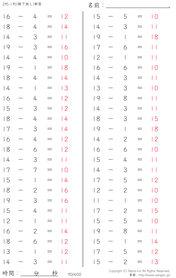 上記のボタンから「20未満-1桁(繰下無し)」の算数数学ドリル・計算ドリル(PDFプリント)がダウンロードできます。個人利用は無料です(家庭以外での配布は有料です)。