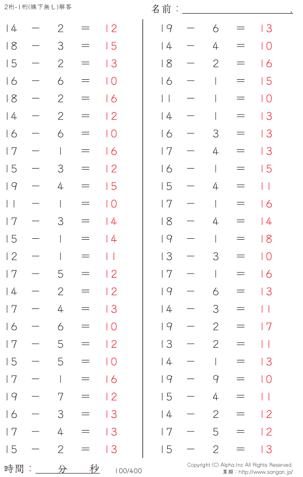 上記のボタンから「20未満-1桁(繰下無し)」の算数数学ドリル・計算ドリル(PDFプリント)がダウンロードできます。個人利用は無料です(家庭以外での配布は有料です)。