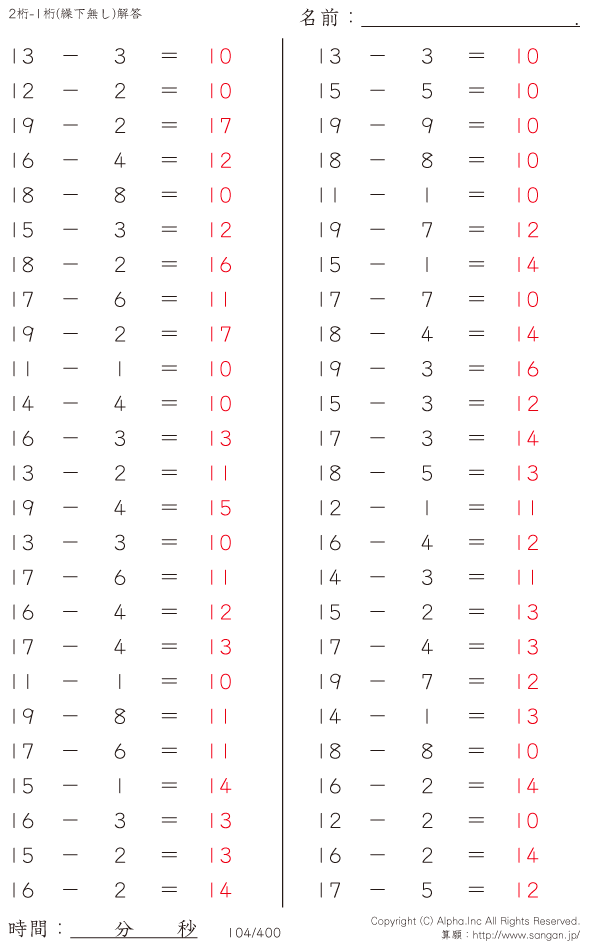 上記のボタンから「20未満-1桁(繰下無し)」の算数数学ドリル・計算ドリル(PDFプリント)がダウンロードできます。個人利用は無料です(家庭以外での配布は有料です)。