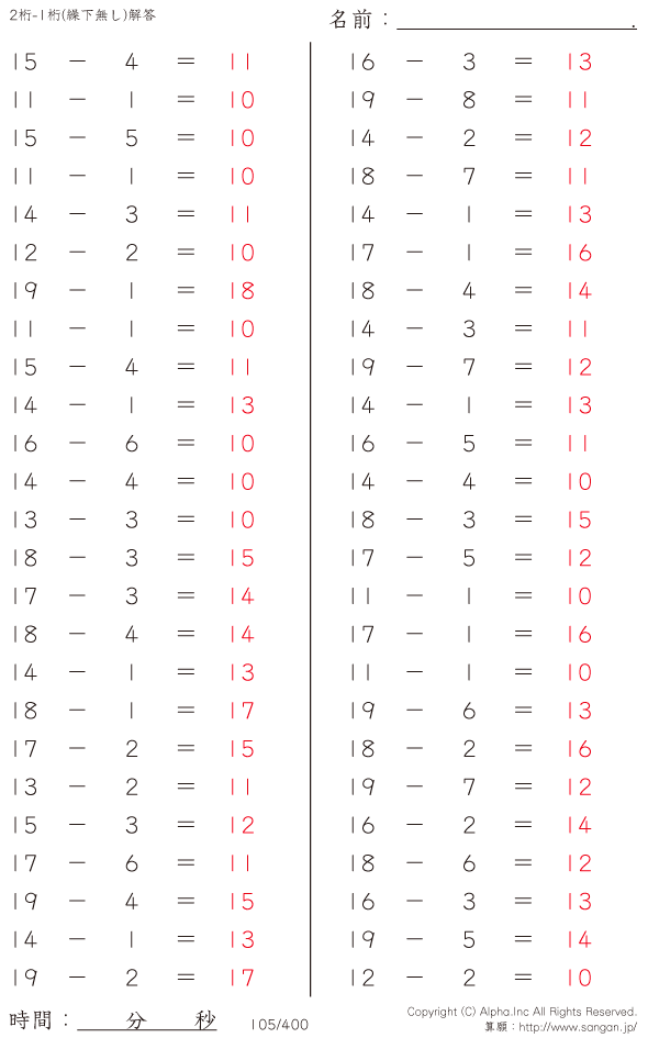 上記のボタンから「20未満-1桁(繰下無し)」の算数数学ドリル・計算ドリル(PDFプリント)がダウンロードできます。個人利用は無料です(家庭以外での配布は有料です)。