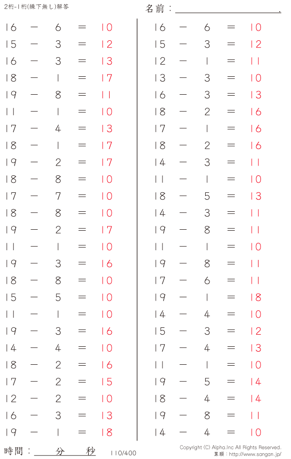 20未満-1桁(繰下無し) [解答]110/400