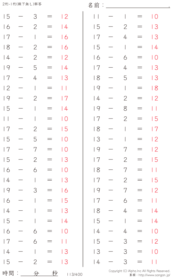 上記のボタンから「20未満-1桁(繰下無し)」の算数数学ドリル・計算ドリル(PDFプリント)がダウンロードできます。個人利用は無料です(家庭以外での配布は有料です)。
