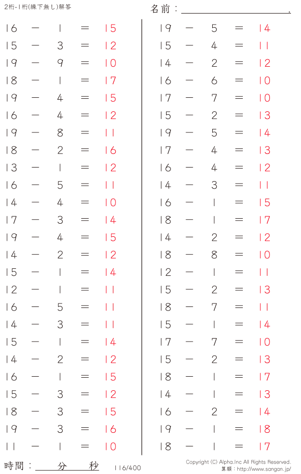 上記のボタンから「20未満-1桁(繰下無し)」の算数数学ドリル・計算ドリル(PDFプリント)がダウンロードできます。個人利用は無料です(家庭以外での配布は有料です)。