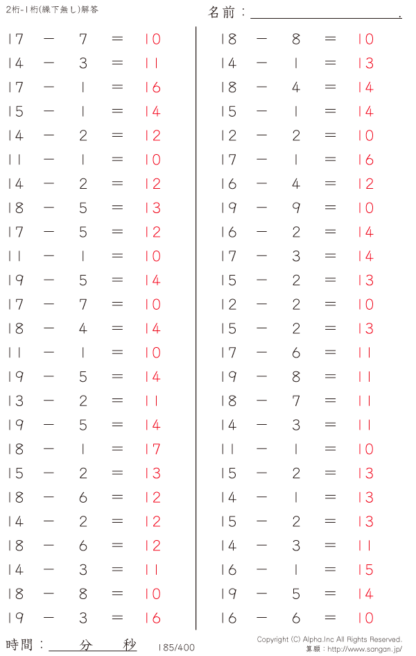 20未満-1桁(繰下無し) [解答]185/400