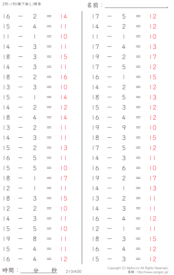 上記のボタンから「20未満-1桁(繰下無し)」の算数数学ドリル・計算ドリル(PDFプリント)がダウンロードできます。個人利用は無料です(家庭以外での配布は有料です)。