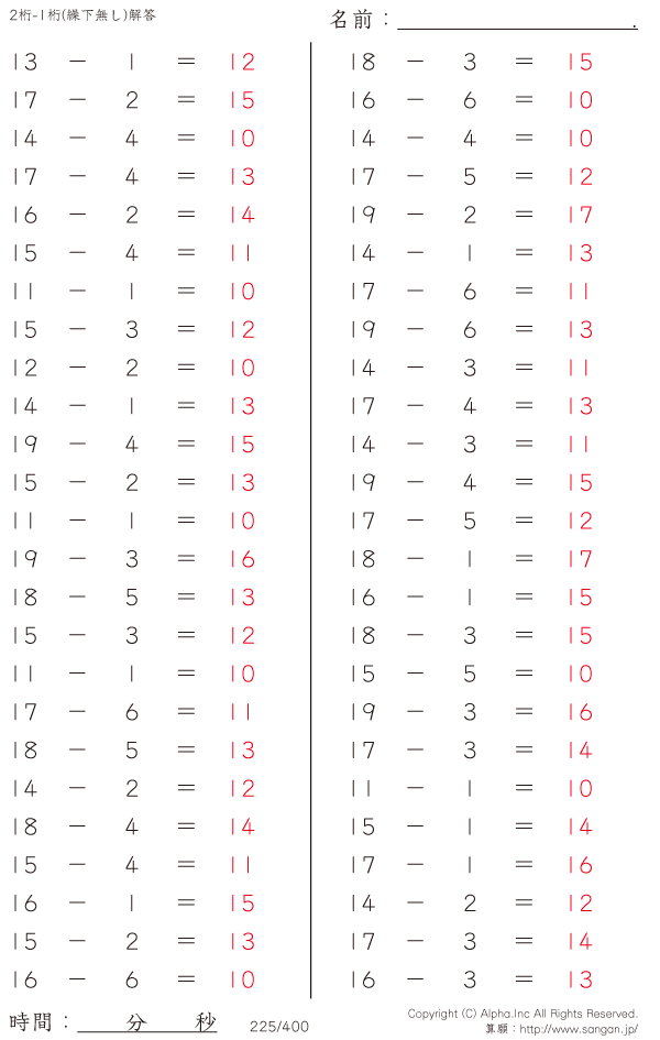 上記のボタンから「20未満-1桁(繰下無し)」の算数数学ドリル・計算ドリル(PDFプリント)がダウンロードできます。個人利用は無料です(家庭以外での配布は有料です)。