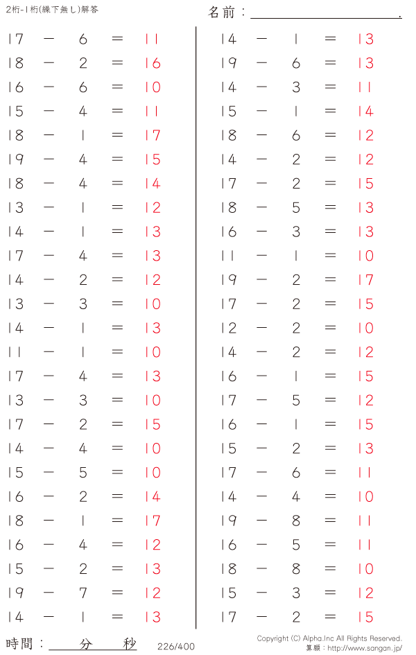 上記のボタンから「20未満-1桁(繰下無し)」の算数数学ドリル・計算ドリル(PDFプリント)がダウンロードできます。個人利用は無料です(家庭以外での配布は有料です)。